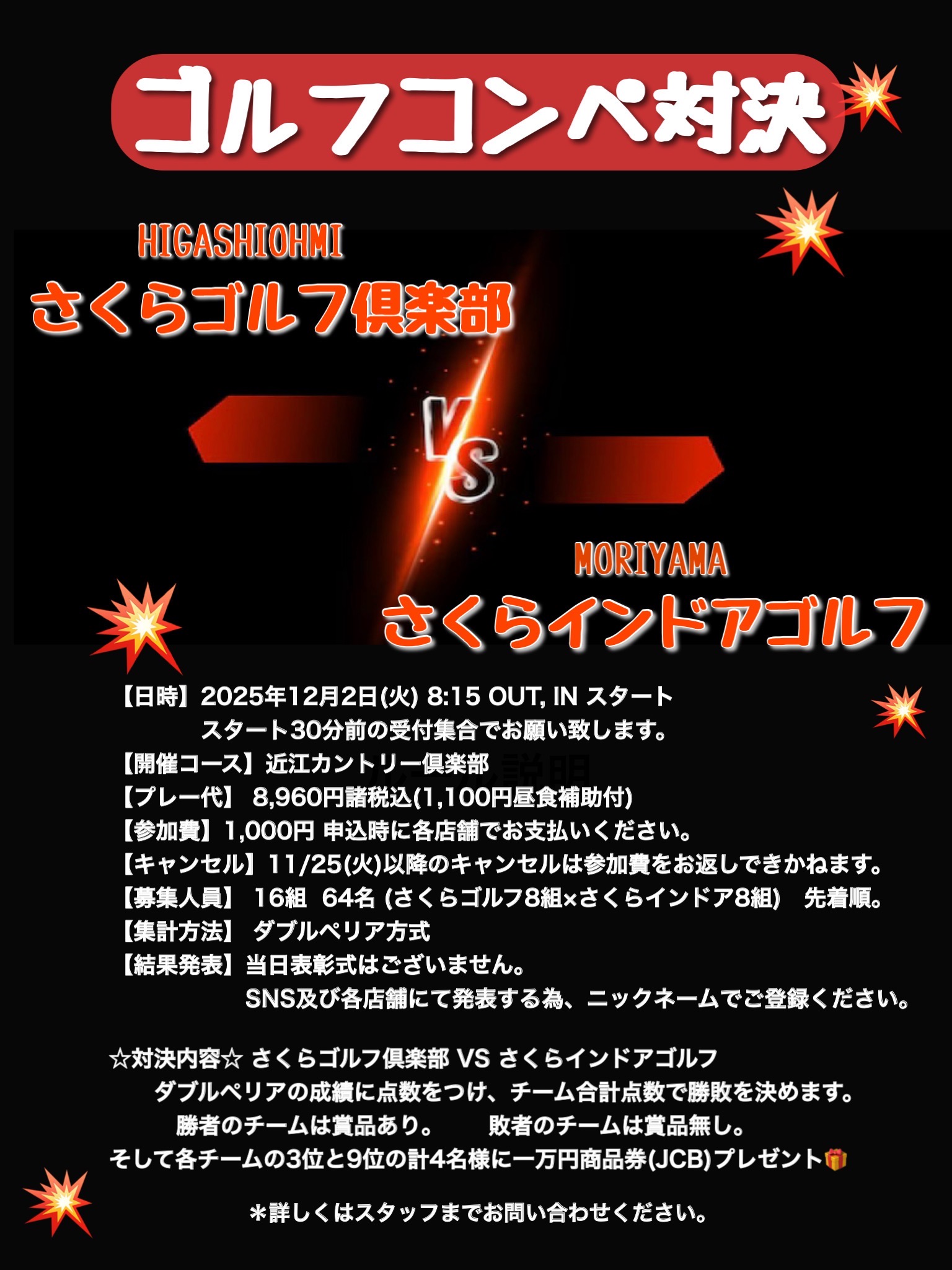 お得情報 2025.10.04 12月2日(火) 第二回ゴルフコンペ対決 開催決定!! 大変お待たせいたしました(^^)/ 第二回ゴルフコンペ対決開催が決定 前回同様、さくらゴルフ倶楽部VSさくらインドアゴルフ 皆さんで楽しく盛り上がりましょう⛳