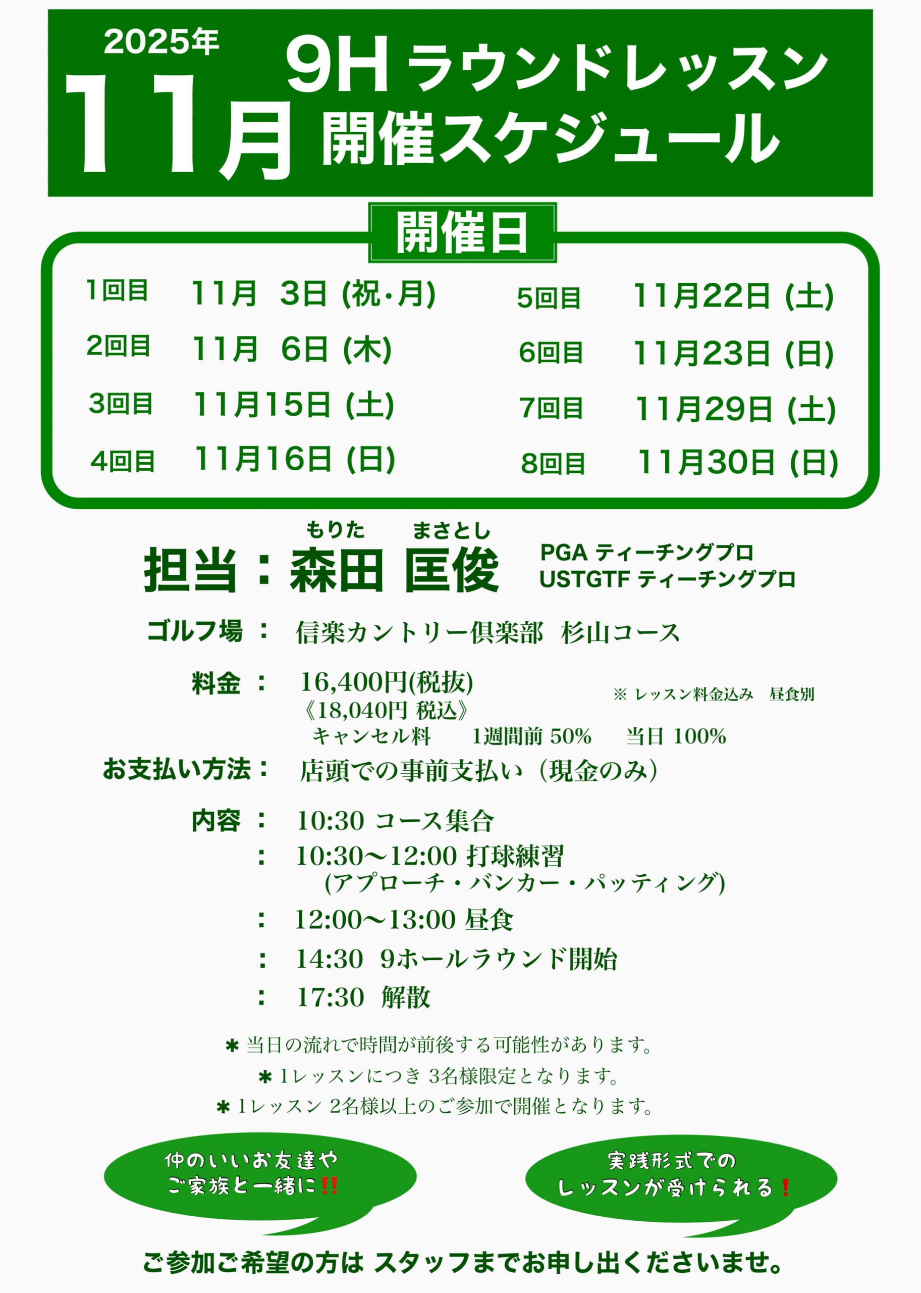 森田プロラウンドレッスン11月開催スケジュール(^^)/