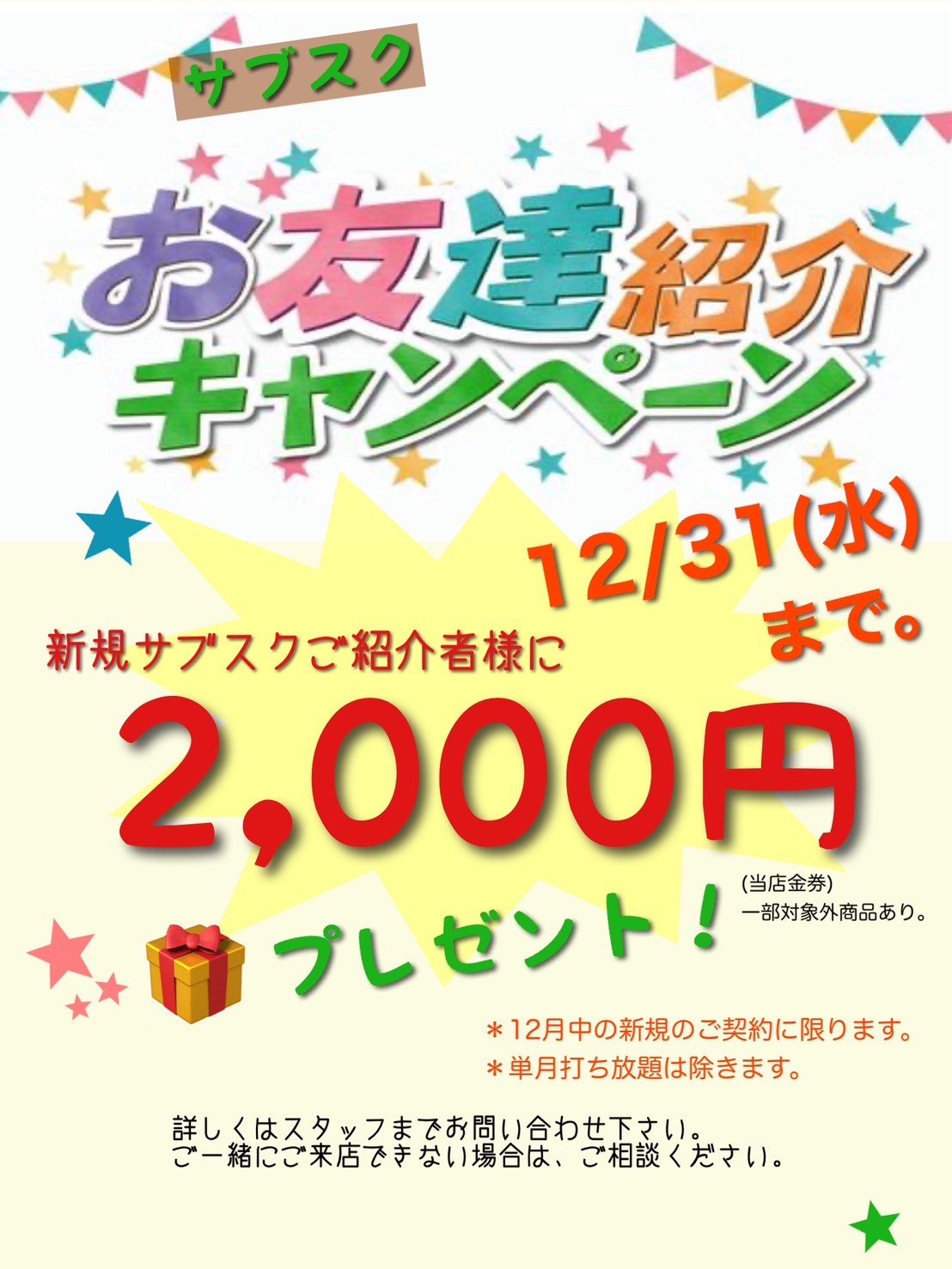 サブスク 12月お友達ご紹介キャンペーン!!