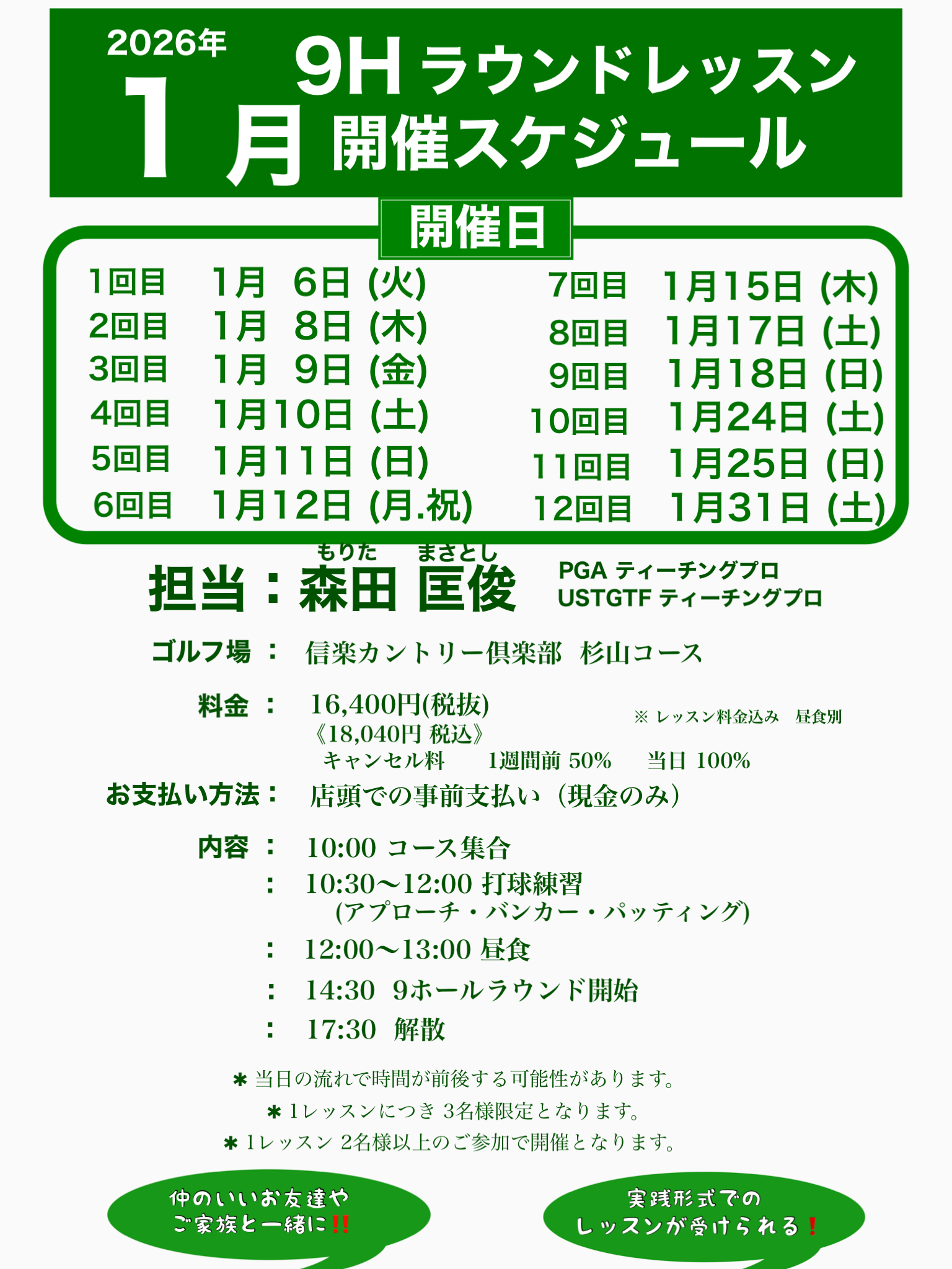 森田プロラウンドレッスン2026年1月開催スケジュール(^^)/