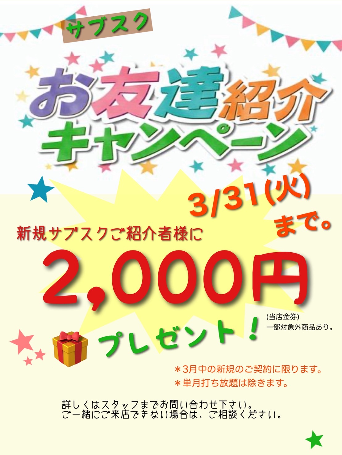 サブスク 3月お友達ご紹介キャンペーン!!