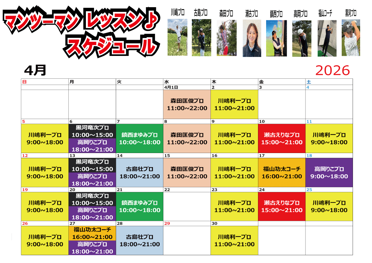 🎵2026年4月度 マンツーマンレッスンスケジュール🎵